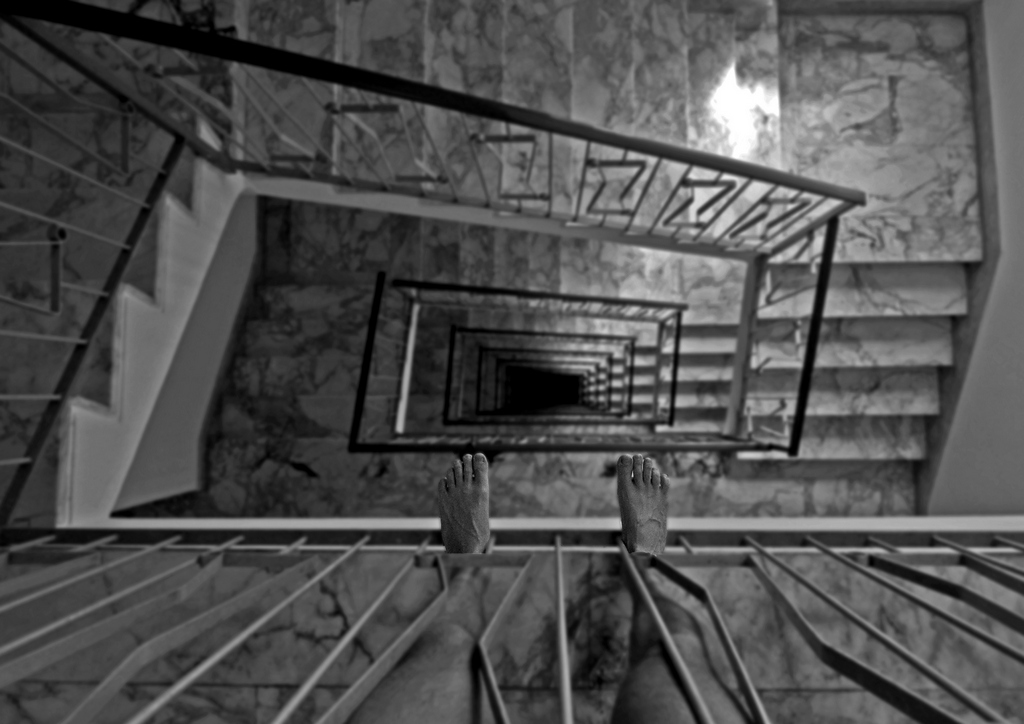 Scena surreale ..il protagonista sembra come volersi gettare bloccato pero' dalla ringhiera che inizia un vortice ipnotico verso l'infinito .