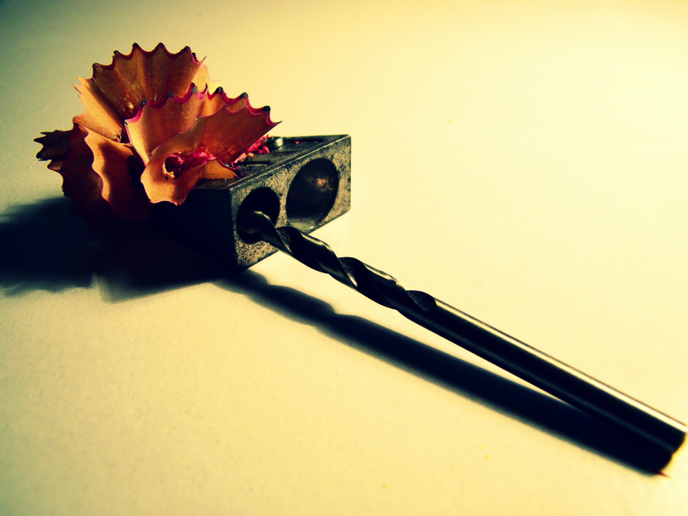 Cerca anche di trovare, quando fai questi esperimenti, un buon equilibrio formale fra gli oggetti; a mio avviso la punta è troppo piccola rispetto al foro e al truciolo.