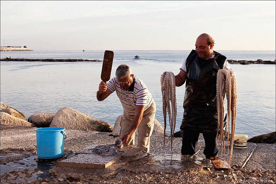 Domenica mattina, subito dopo l'alba, questi uomini dopo aver pescato i polipi con la loro piccola imbarcazione erano intenti "nell'arricciarli", pratica molto diffusa a Bari per renderli più teneri per poi mangiarli crudi.