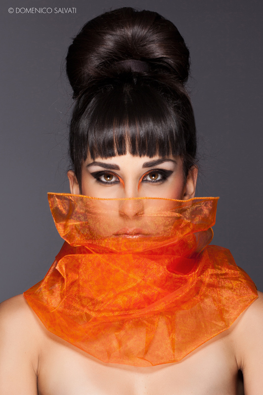 ....Sono ritornato su questa foto..dopo averla "passata" velocemente....perchè forse mi attirava (ma ora ne sono sicuro!) quell'atmosfera chic (il velo arancio, quel trucco, soprattutto quell'acconciatura) anni 60-70 resa più intrigante, e se vogliamo surreale, dalla nitidezza da studio dello scatto. Insomma una foto "d'epoca"....restaurata.