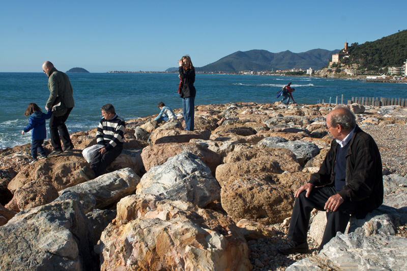 La scena rappresentata é un po' anonima. Quasi tutti i soggetti hanno il viso non a favore di camera. Unica eccezione, la donna in lontananza, che sembra guardare verso il signore in primo piano (o verso il fotografo). Forse é stato questo possibile incrocio di sguardi a motivare lo scatto, ma direi che l'evidenza é troppo debole per catturare l'interesse dell'osservatore, il cui occhio finisce per perdersi sullo sfondo marino. Dal punto di vista contenutistico, la assimilerei piú ad una foto di paesaggio.