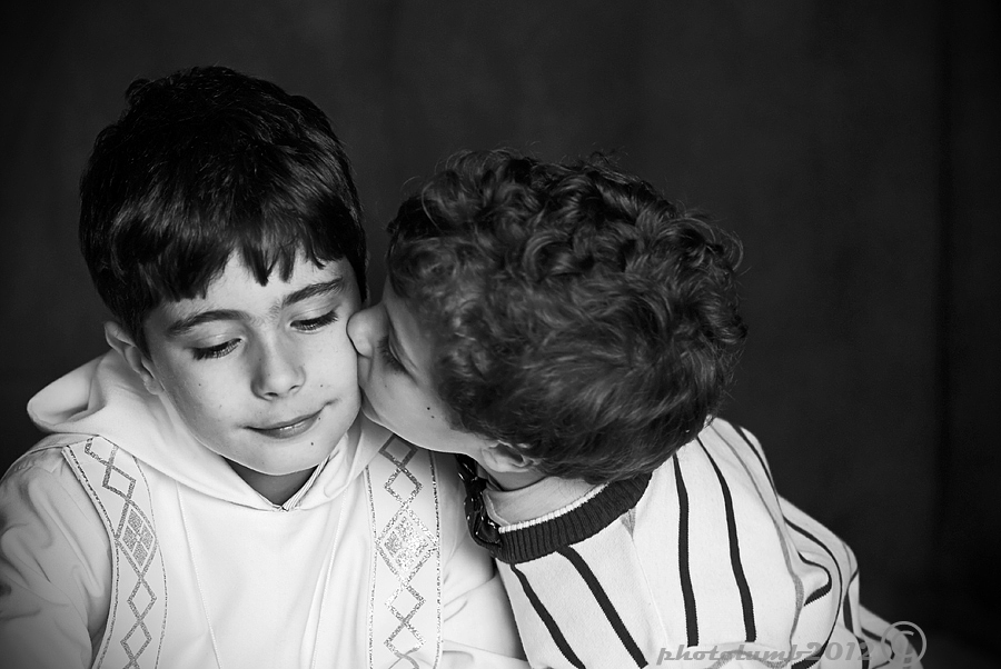 descrivi attraverso questo bel bn secco nel contrasto e grafico nell'importanza dei neri, un gesto di grande tenerezza tra fratelli. un bellissimo ricordo eseguito con cura e capacità fotografica, da conservare per sempre.