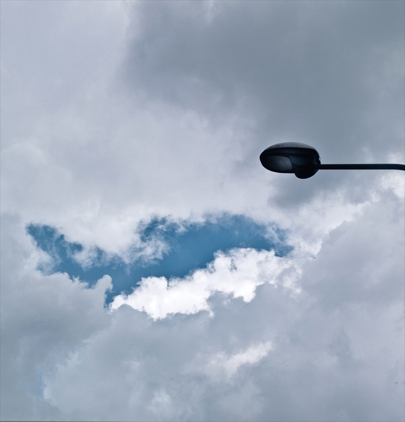 Con un altro lampione posto simmetricamente alla sinistra, quello squarcio di cielo azzurro tra le nuvole si sarebbe trasformato in una bocca con un paio d'occhi in alto...