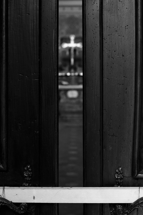La chiesa, o quello che è, chiusa da una stecca di legno, è interessante, stimola il pensiero, l'inquadratura però non mi soddisfa, la stecca è troppo bassa ele maniglie sono tagliate, il b/n mi piace