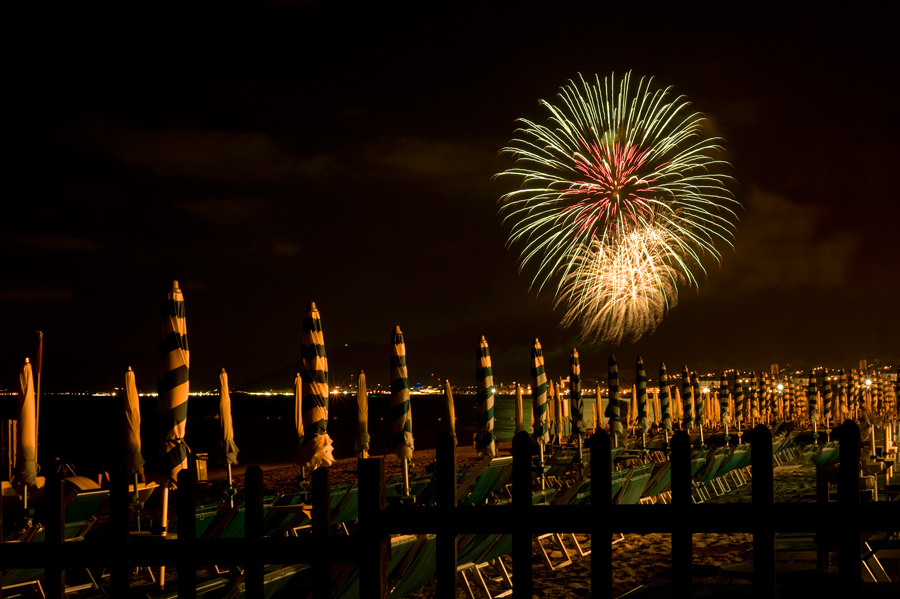 Ottimo tempismo Maurizio, non è semplice cogliere così bene i fuochi d'artificio. Ben composta anche la zona sottostante, piacevole lo steccato reso in silhouette e la serialità degli ombrelloni chiusi. Avrei soltanto raffreddato un pelino i toni, soprattutto quelli sul cielo, qui tendenti al marroncino.