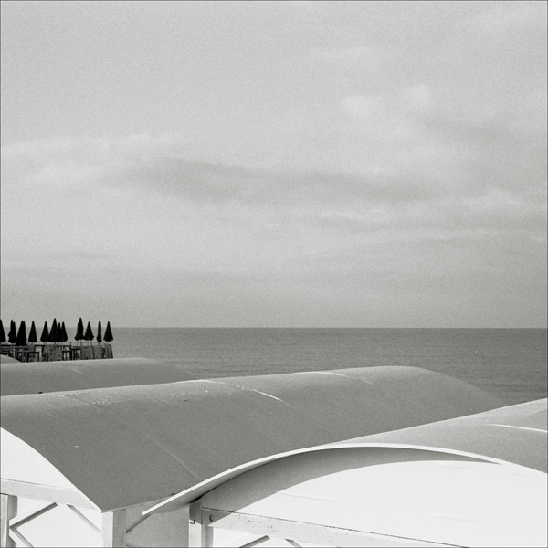 Molto bella la vaghezza accennata di questa viosione marina. Sospesa fra e ondulazioni delle tettoie e i profili in nero degli imbrelloni. Un mare lontano dai fasti del mezzogiorno estivo. Quando ancora solitudine e silenzio ci fanno precepire quasi il sospiro delle maree.