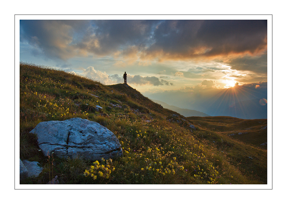 Per me il masso in primo piano ci sta bene, fa da quinta e dà profondità. Bella immagine, "magicamente" suggestiva e che si differenzia dal "solito" tramonto soprattutto per la presenza umana in cima. Ciao _________________ Ilio |
