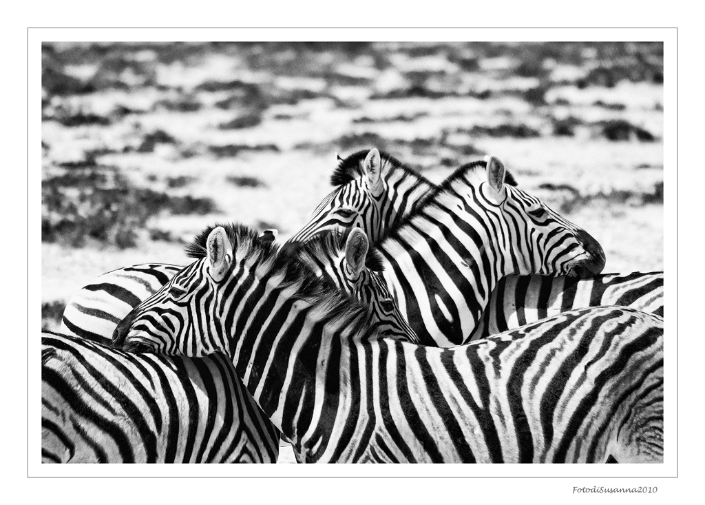 Stavo per rinunciare poi ho provato con un po' di ArtWork a cercare di esaltare solo le zebre e attenuare lo sfondo, a renderlo un po' meno presente... così, tanto per vedere cosa ne usciva fuori... te la propongo, insieme ad una versione in BN.