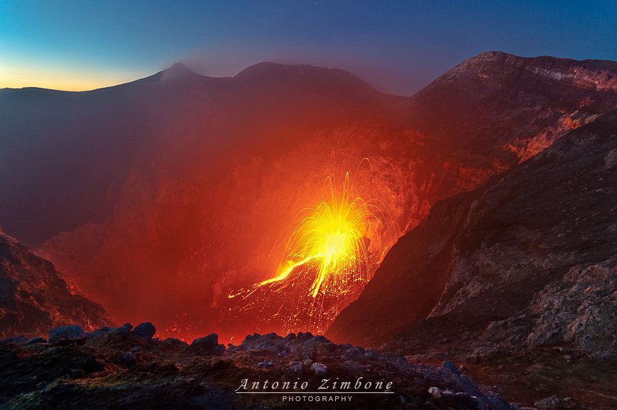 Nebulose leggere che si spargono sul limitare dei pendii, sensazione di calore che si polverizza visivamente alla bocca del vulcano, e una fontana di luce dove i lapilli alzano con grazia il loro fuoco. Il clou spettacolare della immagine sta tutto nella centralità felice di questo ciuffo di lava... che domina la conca notturna e la colora di sfumature fantastiche.