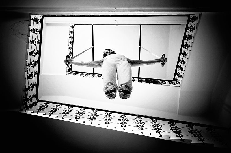 Metà atleta, metà cristo. Decisamente surreale, ben composta, con attenzione al disegno della ringhiera. Escludendo che si tratti delle Olimpiadi di condominio puoi raccontarci di cosa si tratta?