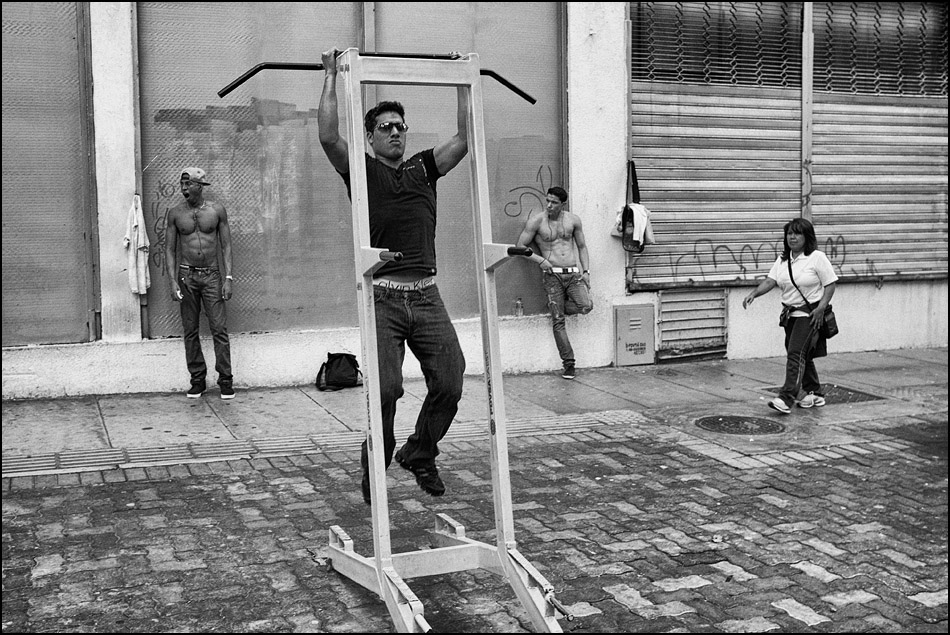 Sisto: anch'io, dopo l'iniziale disappunto per l'entrata in scena della ragazza a dx, ho pensato che la sua presenza potesse essere utile a contestualizzare la scena, facendo capire meglio che si trattava di un marciapiede cittadino. A Caracas si incontrano frequentemente aree all'aperto attrezzate per esercizi ginnici, però di solito sono all'interno di parchi o giardinetti pubblici. Cosi' sulla strada mi è sembrato piuttosto inconsueto. Grazie del passaggio Smile