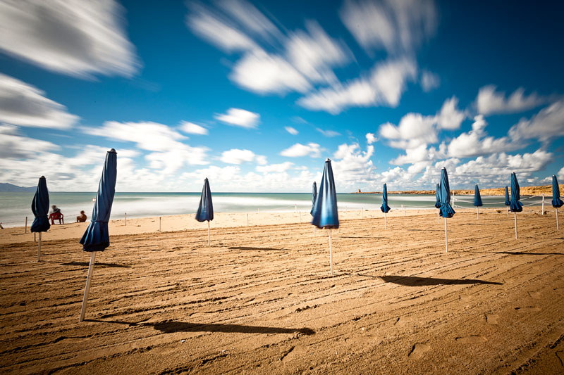 Mi piacciono: il perfetto esempio di come si possono rompere consapevolmente le regole, in questo caso quella che vuole l'orizzonte mai al centro: l'analogia tra le nuvole sparse e le file di ombrelloni è sottolineata proprio dalla simmetria cielo-terra Ok!
