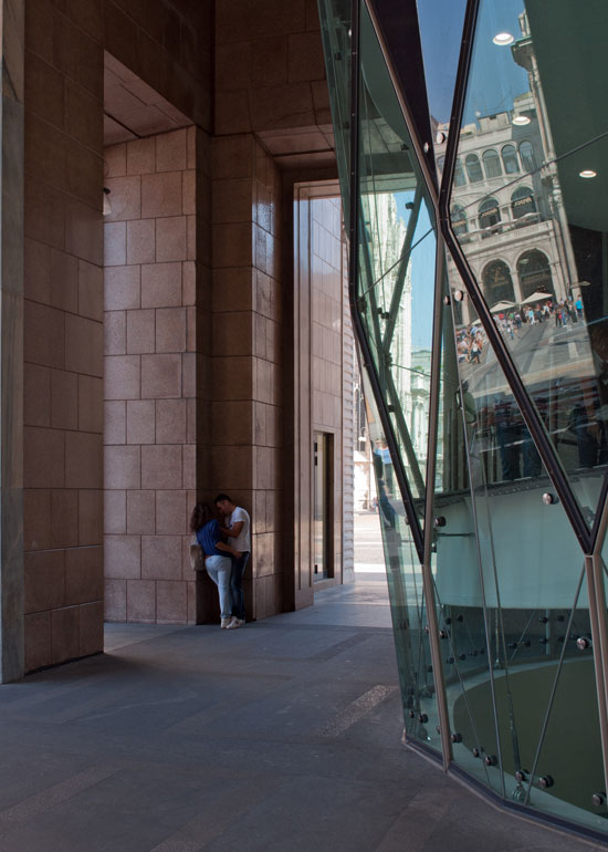 Concordo con Silvano sul fatto che avresti potuto avvicinarti di un altro poco...anche così com'è, però, non mi dispiace affatto, in particolare per la struttura architettonica sulla destra, i cui vetri lasciano intravedere dai riflessi la piazza attigua, dalla quale la coppia si è voluta isolare.
