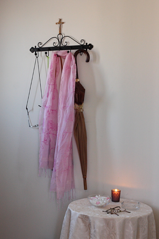Nel dibattito sull'ombrello (e qui il pensiero corre ad Altan Rolling Eyes ) trovo che possa anche rimanere lì dov'è, e che forse senza si sarebbe rischiato il risultato a prima vista lezioso. Alcuni dettagli interessanti rendono originale il soggetto: l'attaccapanni con annesso crocifisso (che in realtà escluderei fosse incorporato al manufatto ma così sembra ed otteniamo quindi un oggetto veramente straordinario!) e poi la serie di occhiali (appesi, poggiati) che popolano la scena. E ancora lumini, confetti... In fondo un insieme di oggetti al limite del surreale (e forse oltre).
