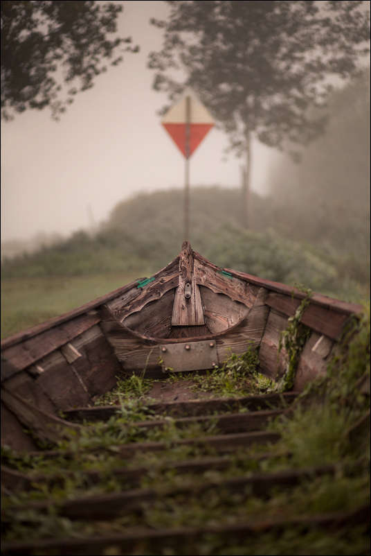 Felice, ed impeccabile la costruzione che unisce il rudere che mai più navigherà, ormai fa parte della terra, con i cartelli che la navigazione governano.