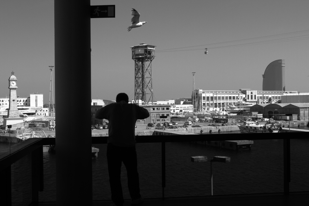 Pare che l'uomo si stia scaldando le "alette" per spiccare il volo, come il gabbiamo sopra la sua testa: è una posa spiritosa che può assumere anche un'interpretazione poetica, onirica.