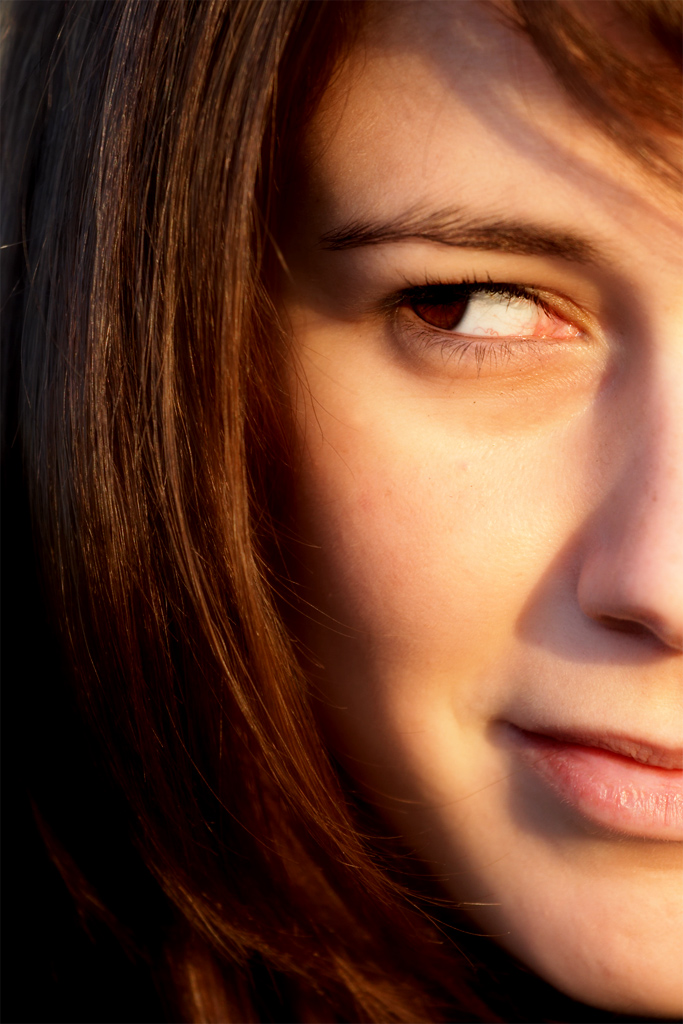 Anche se adesso vengono fuori altri difettucci che si notano maggiormente: il bilanciamento del bianco non mi sembra corretto, anzi mi sembra che cambi da una zona all'altra del viso, hai usato una luce mista naturale/artificiale? Se si, è una cosa abbastanza difficile da gestire correttamente; se no, c'è qualche errore nel bilanciamento, che puoi correggere dall'originale.