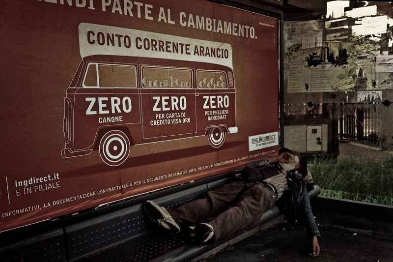 Con un po' di ironia ed amarezza, ricorda la pubblicità dell'uomo sul cartellone e la crisi dei nostri giorni. Uno scatto significativo.