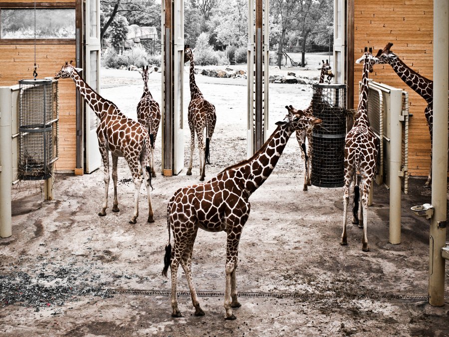 l'esterno invece che dovrebbe essere l'ambiente naturale delle giraffe, è mostrato in un bianconero insipido...come una prigione, come in effetti è.. |