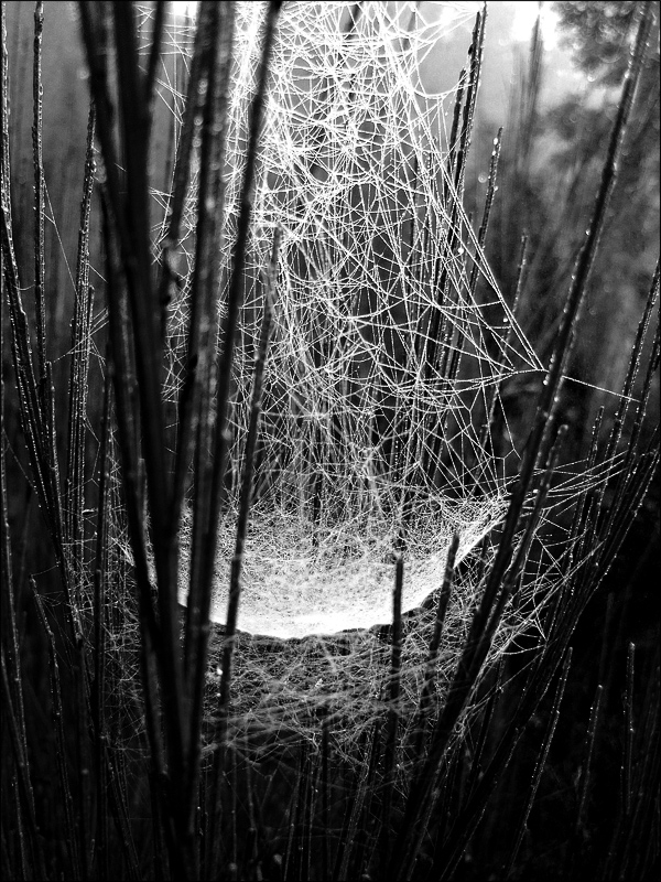 Niente male ma....nella parte bassa la luce piu forte si individua in quella sorta di curva/trappola, molto bella devo dire, il bianco esce fuori bene dal buio circostante, il secondo punto bianco invece si trova sul bordo superiore dell'inquadratura, secondo me poteva essere escluso rifilando, questo perchè fa fare un giro inutile allo sguardo, i punti focalizzanti mi sembrano la trappola e l'intreccio di tela sovrastante, il bianco nella parte superiore non ce lo vedo.