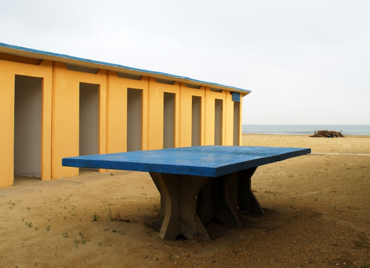 anche la linea del mare leggermente inclinata, sembra che vada ad incontrarsi in un punto immaginario con la spiovenza del tetto.