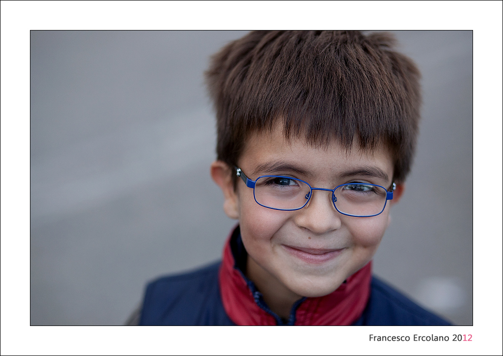 Hai giocato con un bellissimo dialogo muto fra gli azzurri della montatura occhiali e del gilè. E il volto si sospende nella morbidezza di questo sfocato importante. La cosa più bella del ritratto è la serena simpatia del volto e la resa morbida dell'incarnato. Se c'è un difetto qui per me è da ricercare nella restituzione non perfettaemente atmonica dello sguardo, con l'occhio alla nostra destra tagliato di netto dal bordo della montatura. Bella lente se, come credo, si tratta del Canon 85 mm