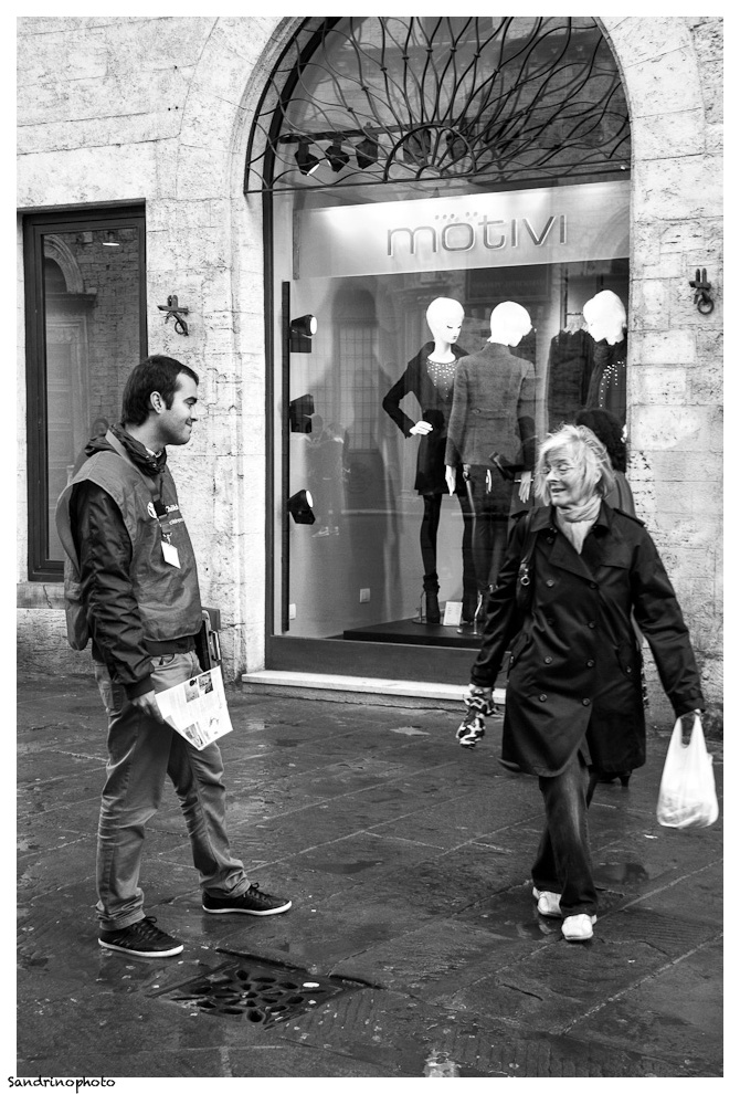 A mio modo di vedere la scritta contestualizza lo scatto ed i manichini completano la coposizione con le loro "facce" indifferenti.