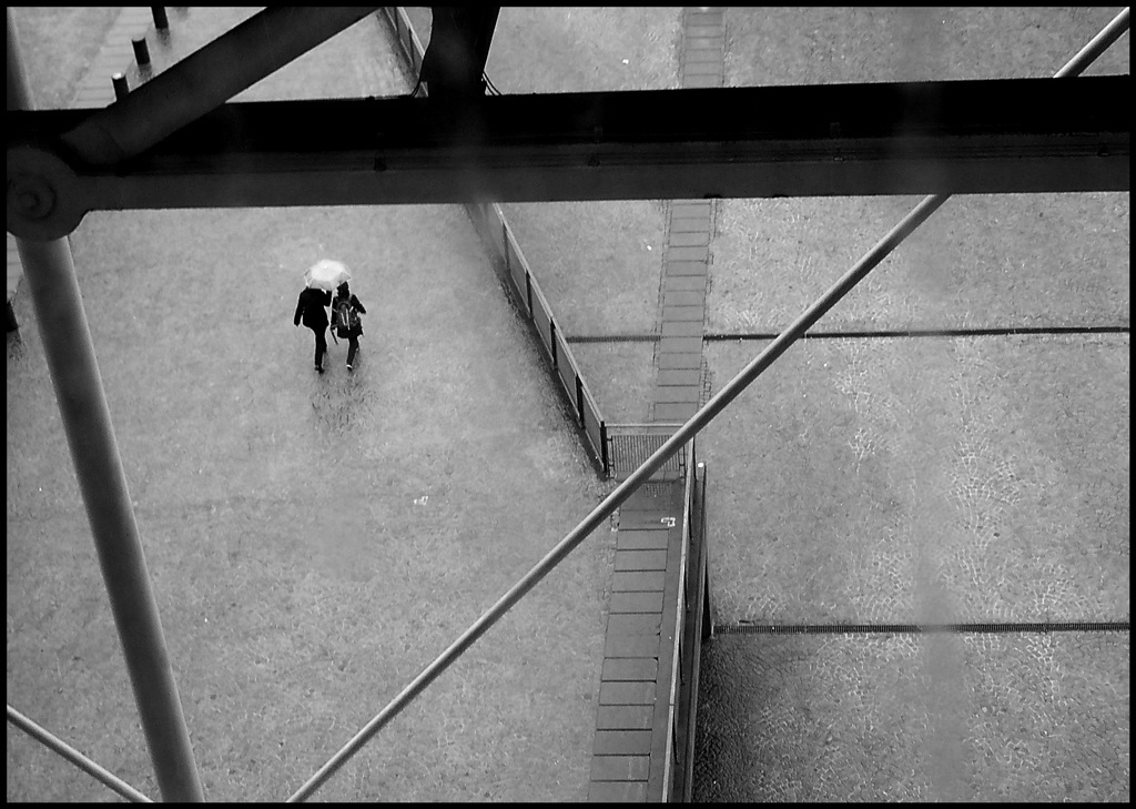 | mi piace come la presenza umana, in maniera dinamica e improvvisa, spezza il rigore architettonico: delle transenne, dei pali, dei sentieri piastrellati.