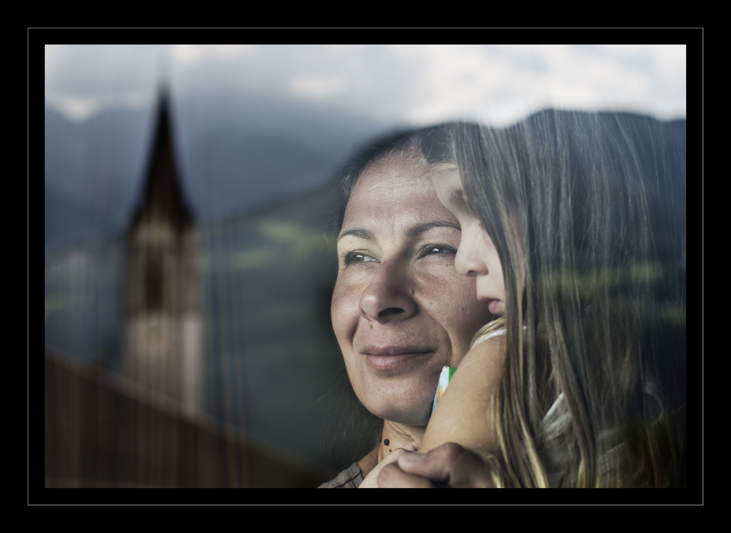 Guardo al calore di quella stretta, ...del premere dell'una contro l'altra in un contatto "pelle a pelle" dalla forte tensione emozionale. E guardo a quegli occhi luminosi che spingono il flusso dei pensieri oltre il riflesso sul vetro della finestra. E' uno sguardo che "sa" di amore, fiducioso e sereno, ...che pare prefigurare le immagini di un futuro che si vorrebbe radioso per chi amiamo, ...e che alla ricerca di una strada per quel futuro sembra indugiare lungo il profilo del paesaggio lontano.