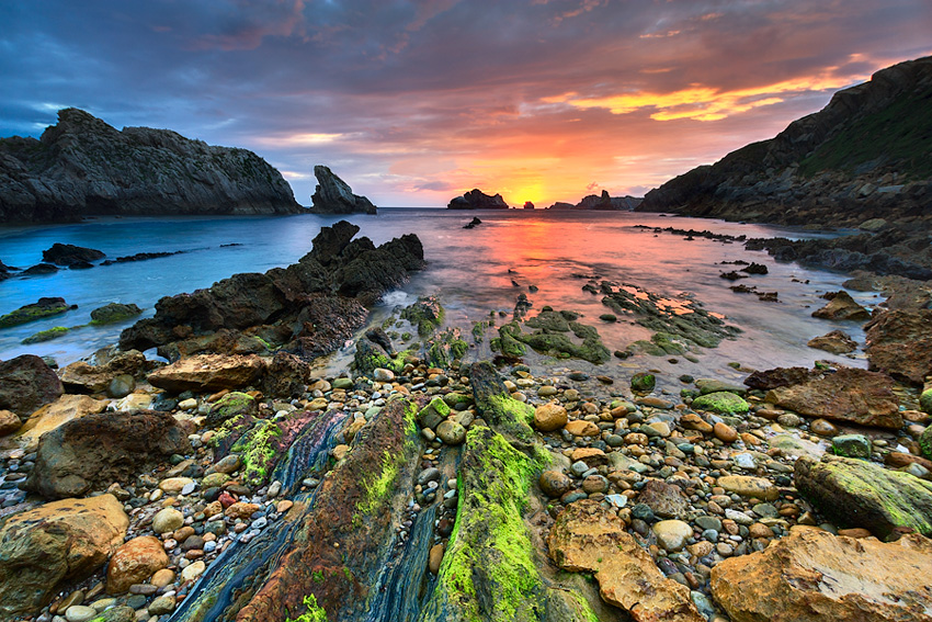 Un tripudio di colori in una classica composizione dove il primo piano introduce e guida all'osservazione della fotografia. Forse un po' troppa MdC (il bordo della scogliera di destra e' piuttosto segnato) qualche dominante ciano e, in generale, a mio gusto, ridurrei un po' la saturazione.