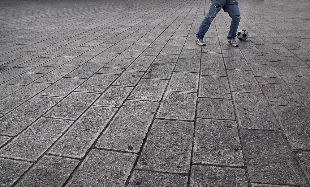 Mi spiace Vittorio, questa volta hai...toppato, sensazione/i tutte errate! Ti pare che se avessi voluto "costruire" la scena non avrei pensato a qualcosa di meno banale (e...palloso ), magari piazzando distesa per terra anche una delle mie amiche bambole...guerce ? A parte gli scherzi, scena del tutto nature: ragazzo sconosciuto che si destreggiava (più o meno) col pallone sulla piazza e che ho fotografato velocemente e di nascosto. 1/200sec è stato sufficiente a congelare il movimento (lento). Tutto qui.