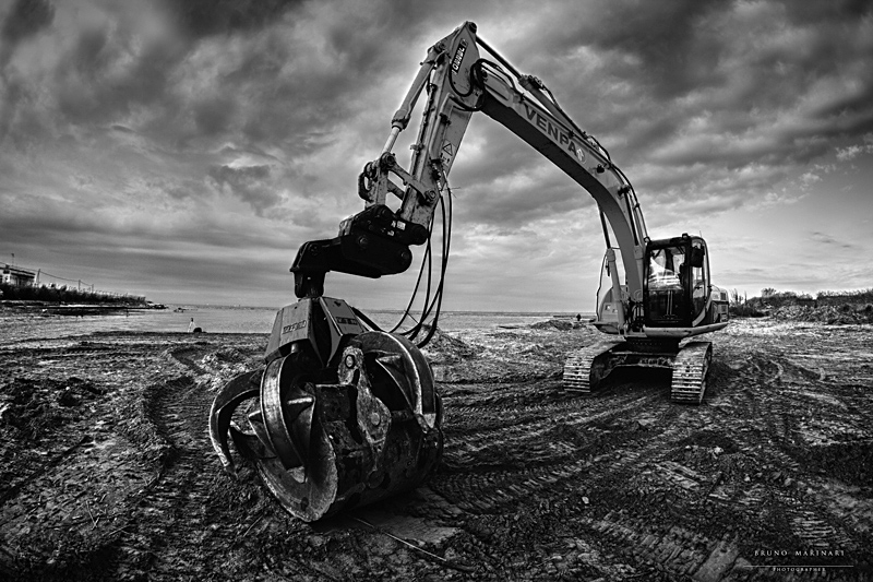 D'effetto la ripresa col grandangolare che estremizza la prospettiva (non vedo i dati di scatto: un 10mm?). B/n grintoso ed efficace. Attenzione però quando si spinge tanto sull'acceleratore del contrasto in particolare per enfatizzare il (bel) cielo a quegli aloni che possono rimanere qua e là: intorno allo snodo del braccio meccanico, vicino al margine superiore, per esempio, oppure sul profilo del paesaggio sulla sinistra. Pende lievemente sulla destra. Una schiaritina appena alla zona degli "artigli" del mostro poteva rendere meglio leggibile quel particolare (se vedo bene sta raccogliendo i resti di un collega defunto!). La mia pignoleria nel sottolineare quelli che a me paiono i punti deboli ti è dovuta data la qualità di molti tuoi scatti .
