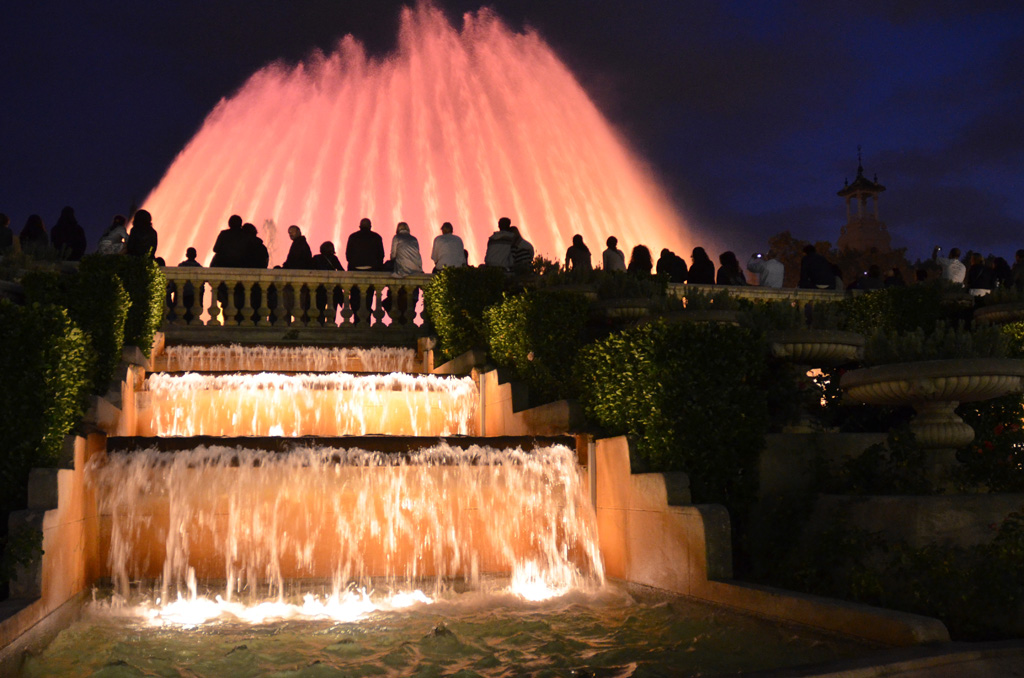 In questa tua foto trovo, devo dire, diverse debolezze: c'è una inquadratura in cui cerchi di far entrare un po' troppa roba, vi si trovano a convivere dei colori che oltre ad essere abbastanza improbabili (suppongo per qualche effetto di luce: il rosa salmonato della fontana superiore è indigesto assai) sono ripresi al limite dell'esposizione, inoltre la nitidezza non è al top. Ma senza dubbio la situazione e la luce disponibile erano ostili ad uno scatto di questo genere.