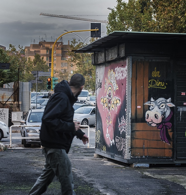 Buona la postura nella quale hai ripreso l'individuo: pare si incammini con fare sospetto, spalleggiato dal figura bovina che sbuca dal chiosco che sembra attendere il ragazzo in un incontro segreto.
