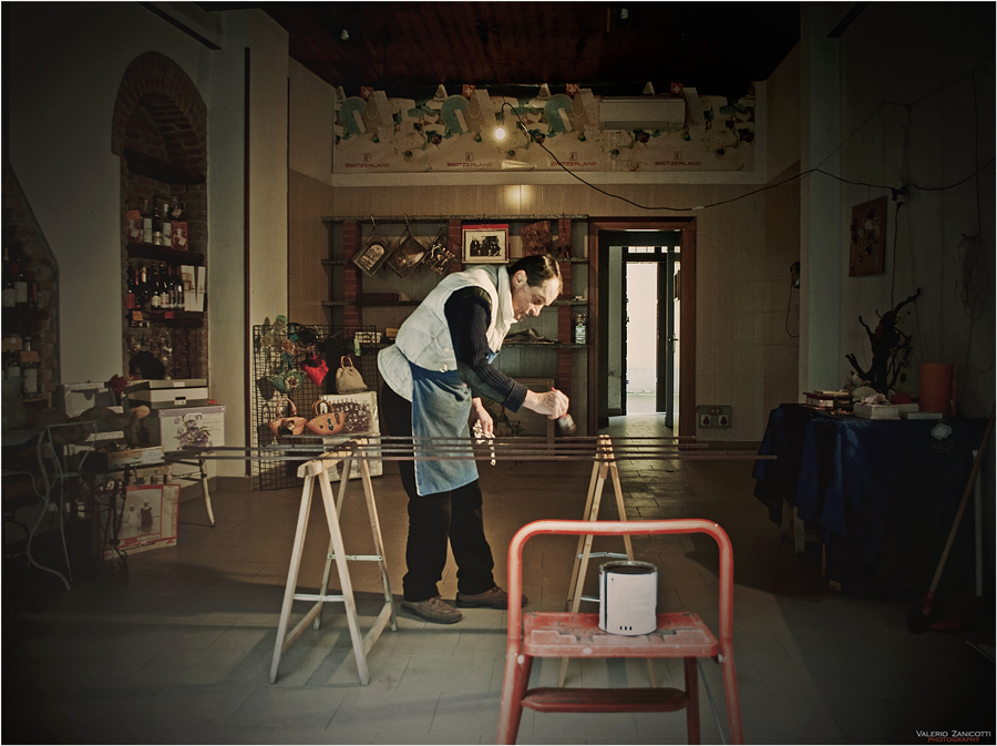 Non so se l'inquadratura allargata era per includere l'ambiente oggetto di lavori in corso, ma amp disperde l'attenzione dal gesto del signore: avrei cercato di stringere di più, non con la vignettatura.