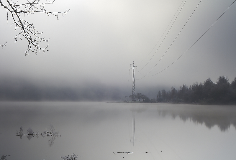 Mi piace la composizione, il ramo in alto e sopratutto i fili elettrici danno il senso della profondità, nell'evanescenza della nebbiolina.