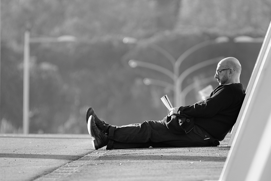 Mi piace molto, bello lo stacco tra il soggetto, isolato perchè sta leggendo e isolato da te col tele, e la strada sullo sfondo.