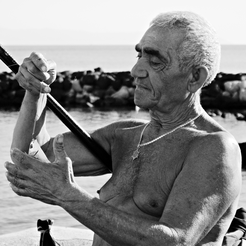 Sicuramente è un'inquadratura al limite, ma non mi sembra un'immagine che richiede riposo, io voglio forzare il rimpallo tra sguardo dell'uomo e pesce, interrompendolo solo per notare particolari che diano maggior forza espressiva al pescatore (la collana, le mani forti e delicate, i pettorali cadenti...)