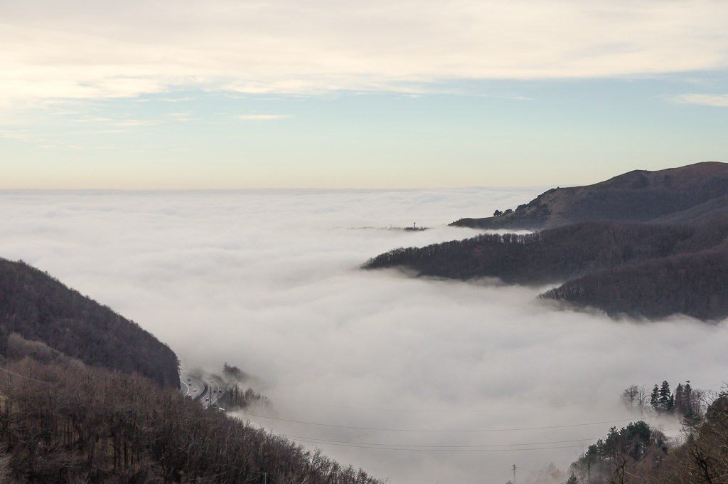Ho scelto un ritaglio piuttosto consistente dell'immagine per isolare il piu' possibile il mare di nubi e le parti interessanti delle colline circostanti.