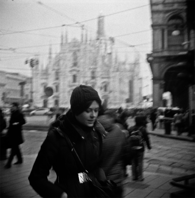 decisamente la città con il duomo di milano, ma soprattutto la ragazza lo sguardo nascosto e trasparente, sono gli elementi che definiscono il respiro della composizione.