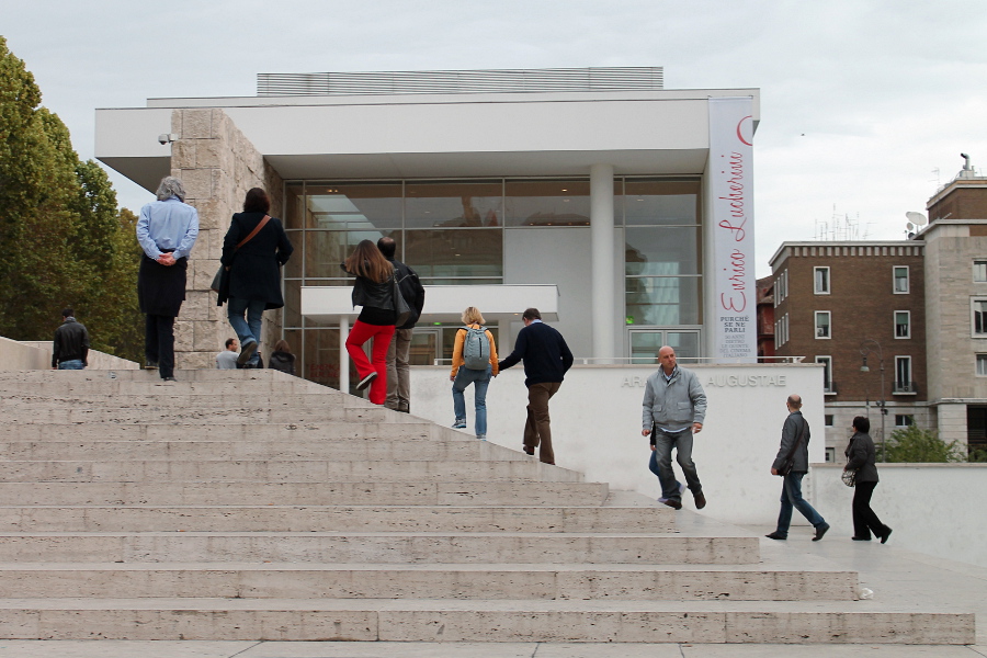 Quella della trasformazione dei gradini in piano inclinato (e pace all'Ara Pacis stortina!) mi pare una buona idea, da sfruttare però meglio aspettando qualcuno che sembri salire con maggiore difficoltà -o col passo sospeso del signore in coppia al centro.