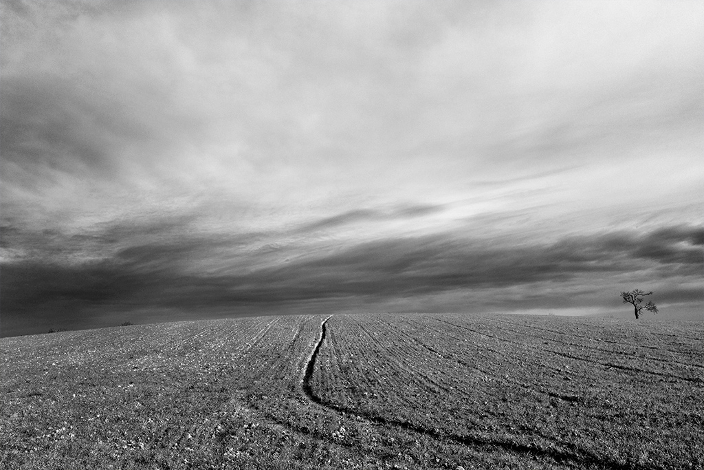 vedo delle belle sfumature di grigio, mi piacciono i pochi elementi che compongono la foto, anche se la parte sinistra al di la del solco è secondo me di troppo, io la eliminerei ricavando un formato quadrato.