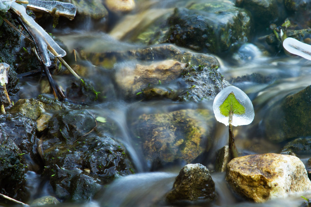 Bella anche per me....davvero ben vista la fogliolina ingabbiata nella prigione di ghiaccio, che si erge con tale decisione fra sassi e flutti