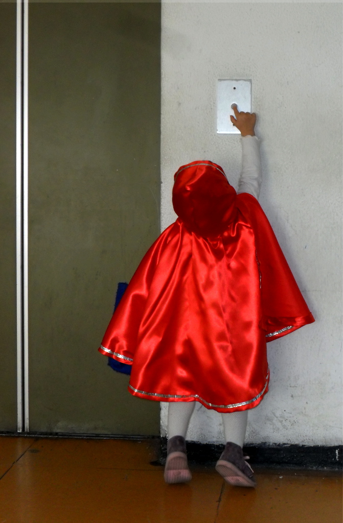 Il solo mantello rosso che identifica la nota storiella e la postura della bambina intenta a raggiungere il pulsante vengono ulteriormente valorizzati dalla intitolazione da te attribuita