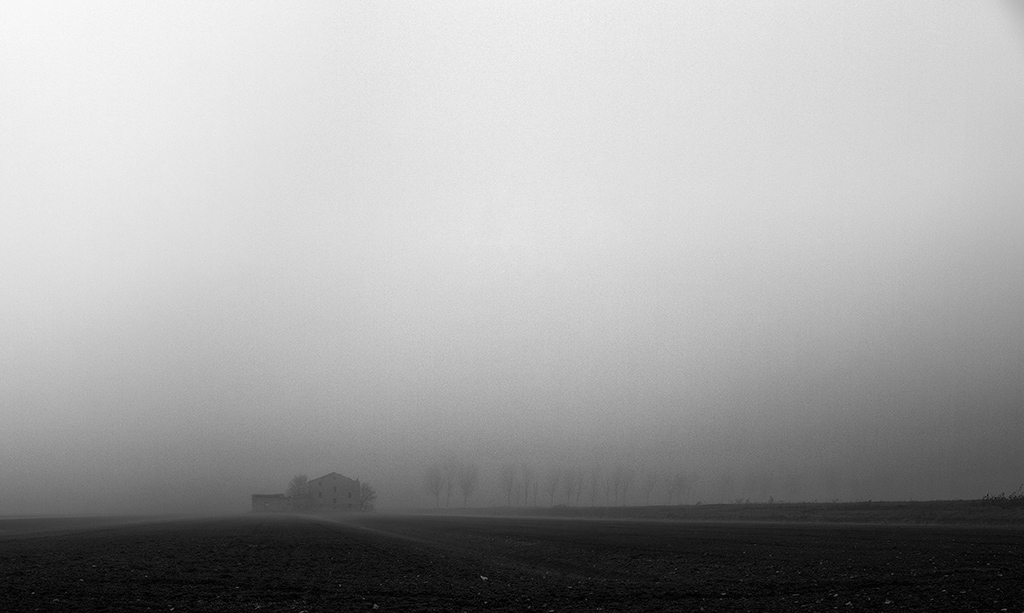 A prima vista, in anteprima , mi sembrava esageratamente ampia la parte superiore, poi analizzandola meglio, mi piace sempre piu questo digradare dal buio della nebbia alla luce di un bianco quasi accecante del cielo, hai reso perfettamente l'atmosfera di una giornata di nebbiolina in campagna.