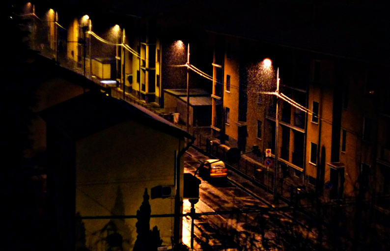 La scarsa qualità tecnica sotto certi aspetti contribuisce a descrivere l'atmosfera particolare di quando - con un forte vento - cade dal cielo acqua mista a neve, ma anche sotto questo aspetto non riesco ad apprezzare l'equilibrio (?) cromatico, in particolare per via della presenza nell'inquadratura di una luce decisamente più bianca.