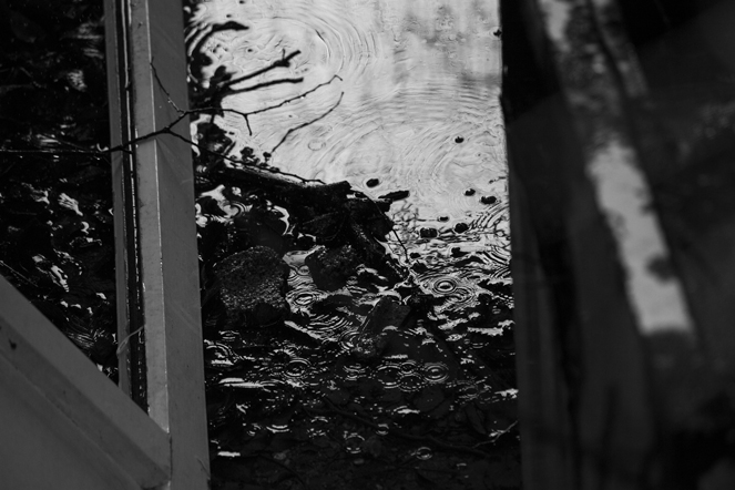 C'è veramente troppa roba nella tua inquadratura, innanzitutto la massa sfocata e illeggibile sulla destra. Ma anche la parte più "interessata", quella con le gocce, è sporcata da parecchie presenze inutili e disordinate. Una maggior pulizia generale ci avrebbe consentito di arrivare prima e meglio al nocciolo della foto, quei cerchi nell'acqua dove scuri su fondo chiaro, dove viceversa.