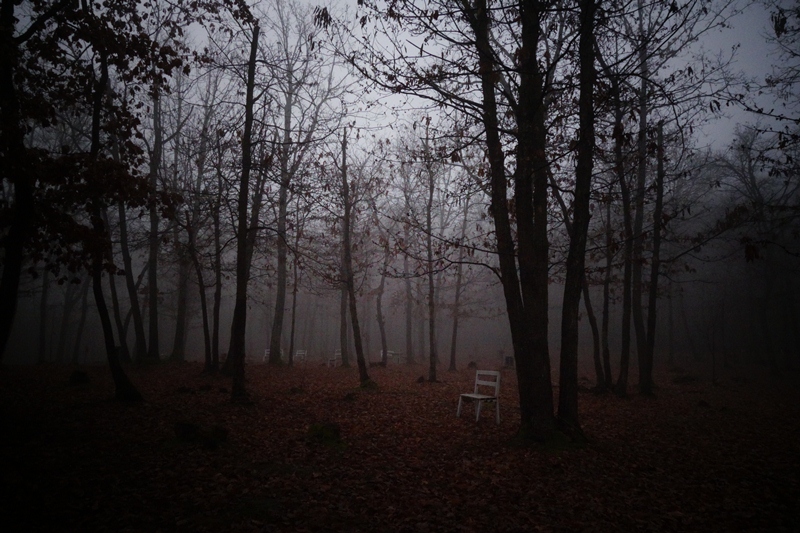 Trovo riuscito il forte contrasto (quasi irreale) fra le sedie bianche e i toni cupi del bosco..