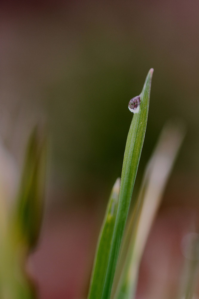 C'erano le premesse per una bella foto, visto lo sfondo e le foglie, ma la goccia di rugiada risulta indistinta sia per mancanza di luce ma anche per il diaframma troppo aperto.