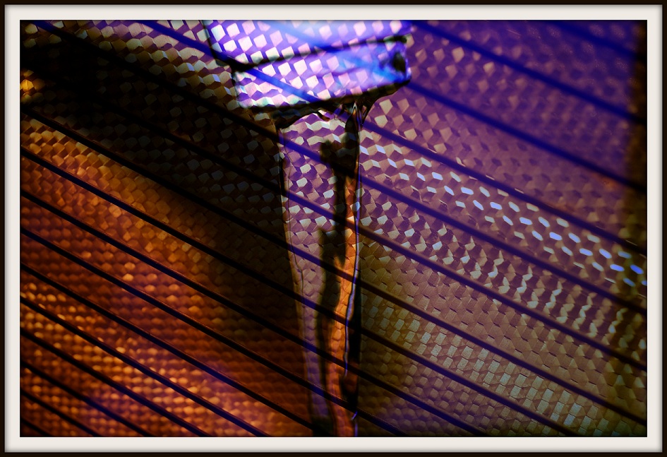 E' una immagine senza dubbio particolare, che però non attira per un elemento preponderante sugli altri.. vedo una fusione e una sovrapposizione di colori, più che elementi diversi.. dove sicuramente la fluidità dell'acqua si contrappone alle linee rigide e alle cellette dell'elemento materiale usato..
